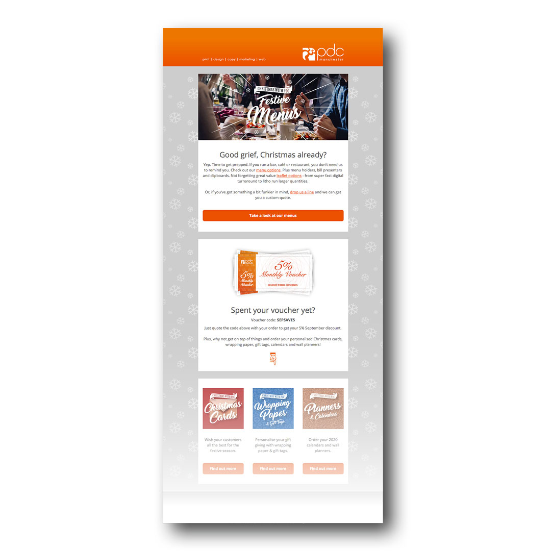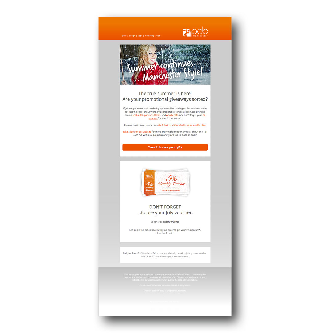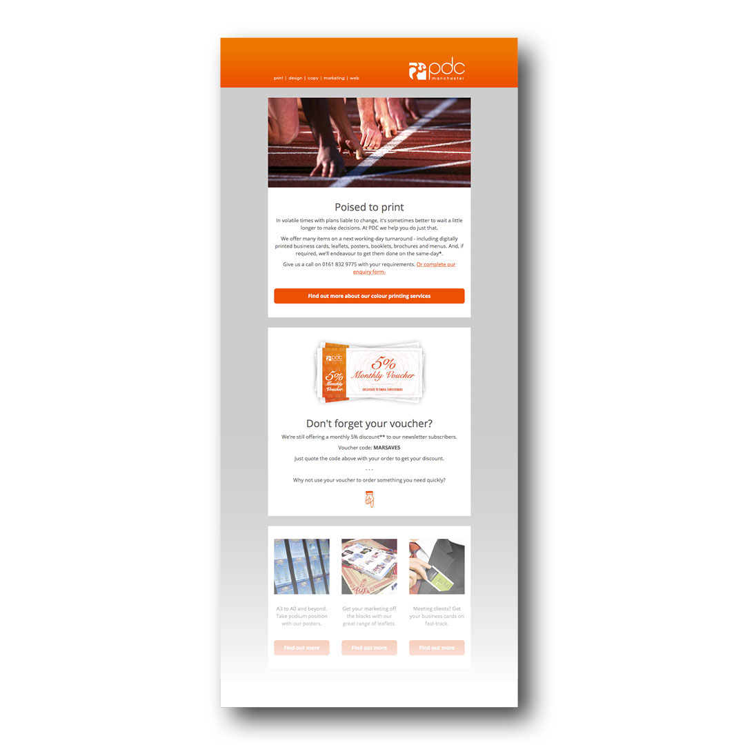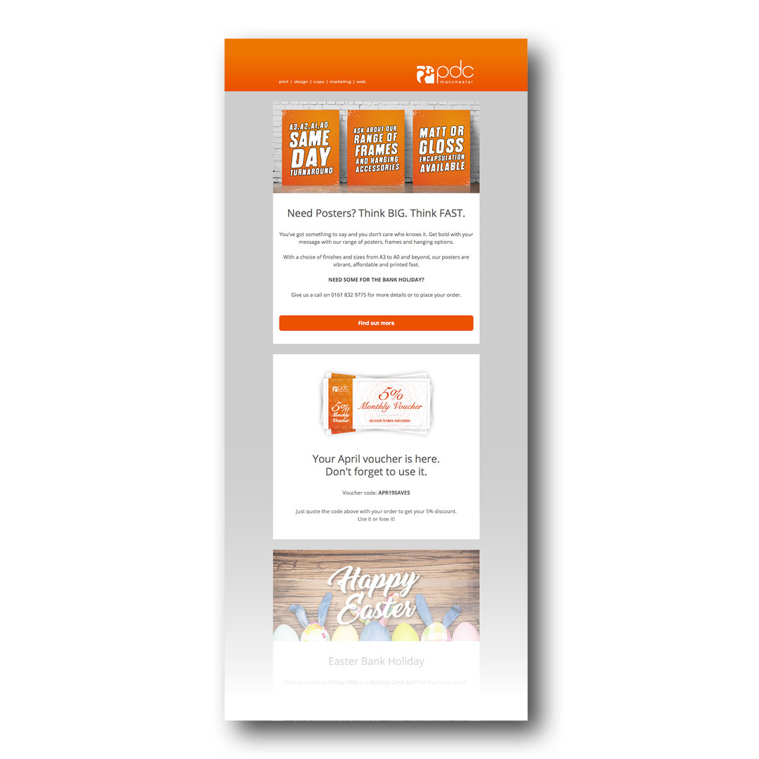 I've utilised Mailchimp to design a set of PDC branded email templates. Using these, I create and send an e-shot to subscribers at least once per month.